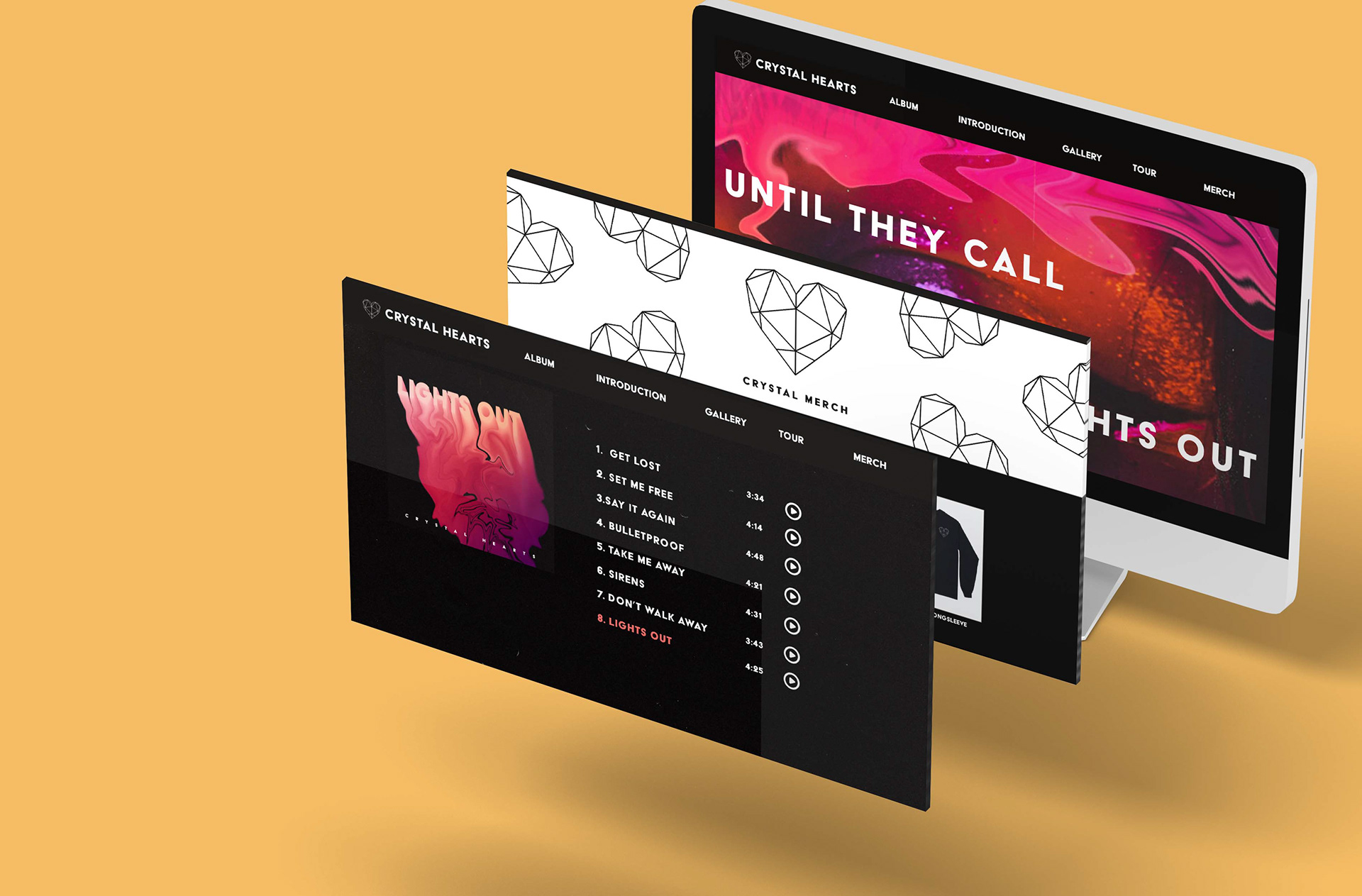 A made up band with a modernized disco-pop sound and vibrant visuals. The album "Lights Out" represents a clubby yet dark design and an experimental play with liquid gradients.